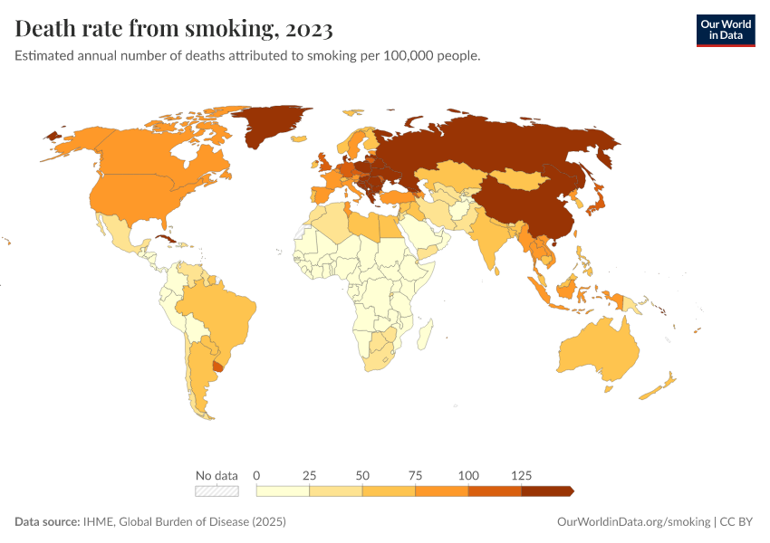 IHME, Global Burden of Disease (2024) – with minor processing by Our World in Data. “Death rate from smoking” [dataset]. IHME, Global Burden of Disease, “Global Burden of Disease - Risk Factors” [original data]. Retrieved February 12, 2026 from https://chart-preview-extension.owid.pages.dev:8789/20250909-093708/grapher/death-rate-from-smoking.html (archived on September 9, 2025).