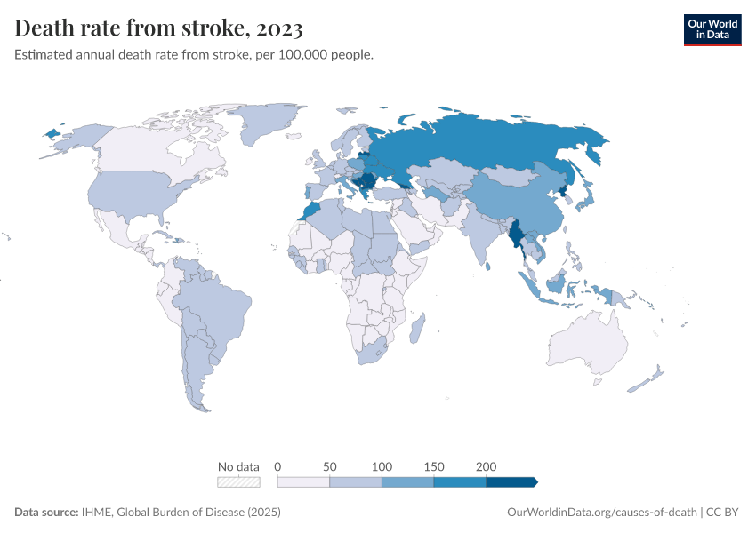 IHME, Global Burden of Disease (2025) – with major processing by Our World in Data. “Death rate from stroke” [dataset]. IHME, Global Burden of Disease, “Global Burden of Disease - Deaths” [original data]. Retrieved February 12, 2026 from https://chart-preview-extension.owid.pages.dev:8789/20260211-174736/grapher/death-rate-from-strokes.html (archived on February 11, 2026).
