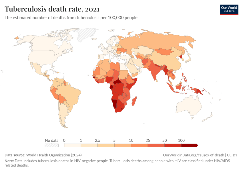 World Health Organization (2024) – with major processing by Our World in Data. “Tuberculosis death rate” [dataset]. World Health Organization, “Global Health Estimates” [original data]. Retrieved February 12, 2026 from https://chart-preview-extension.owid.pages.dev:8789/20250909-093708/grapher/death-rate-from-tuberculosis-ghe.html (archived on September 9, 2025).