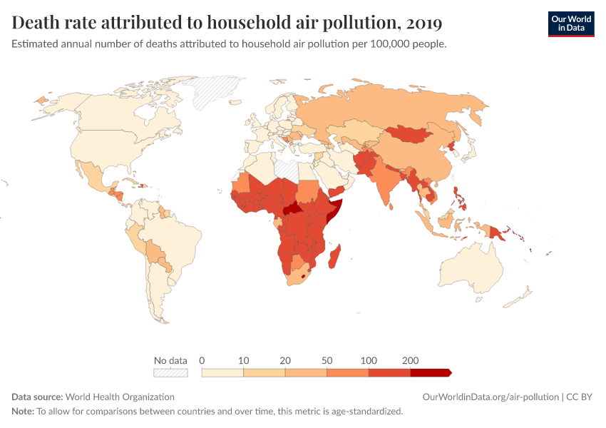 World Health Organization – processed by Our World in Data. “Death rate attributed to household air pollution” [dataset]. World Health Organization, “Global Health Observatory (GHO), World Health Organisation (WHO)” [original data]. Retrieved February 12, 2026 from https://chart-preview-extension.owid.pages.dev:8789/20260130-180113/grapher/death-rate-household-air-pollution.html (archived on January 30, 2026).
