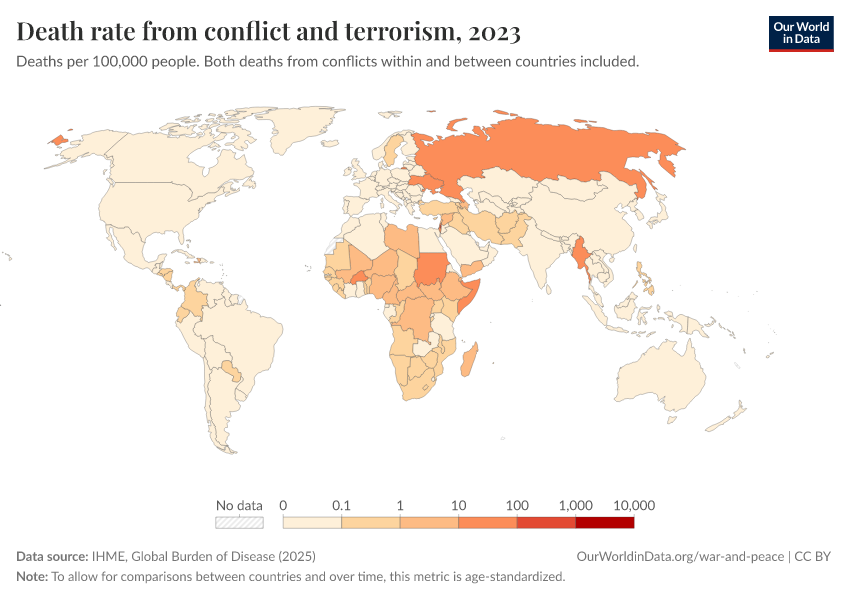 IHME, Global Burden of Disease (2025) – with major processing by Our World in Data. “Death rate from conflict and terrorism” [dataset]. IHME, Global Burden of Disease, “Global Burden of Disease - Deaths” [original data]. Retrieved February 12, 2026 from https://chart-preview-extension.owid.pages.dev:8789/20260211-174736/grapher/death-rates-from-conflict-and-terrorism-gbd.html (archived on February 11, 2026).