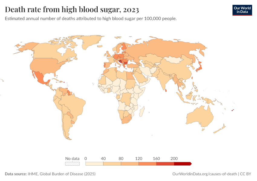 “Data Page: Death rate from high blood sugar”, part of the following publication: Esteban Ortiz-Ospina and Max Roser (2016) - “Global Health”. Data adapted from IHME, Global Burden of Disease. Retrieved from https://chart-preview-extension.owid.pages.dev:8789/20250909-093708/grapher/death-rates-from-high-blood-sugar-gbd.html [online resource] (archived on September 9, 2025).How to cite this data