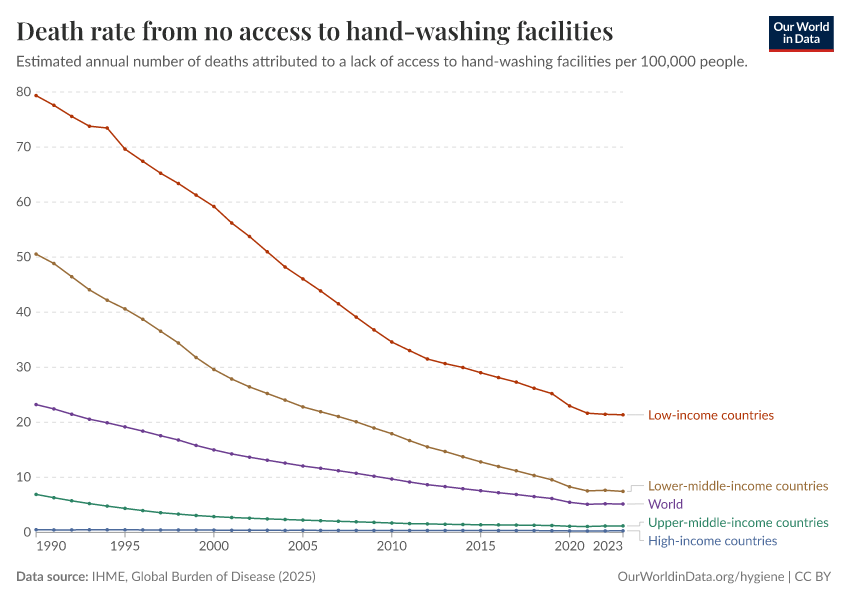 “Data Page: Death rate from no access to hand-washing facilities”, part of the following publication: Esteban Ortiz-Ospina and Max Roser (2016) - “Global Health”. Data adapted from IHME, Global Burden of Disease. Retrieved from https://chart-preview-extension.owid.pages.dev:8789/20250909-093708/grapher/death-rates-no-handwashing.html [online resource] (archived on September 9, 2025).
