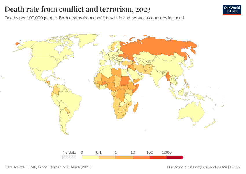 “Data Page: Death rate from conflict and terrorism”, part of the following publication: Esteban Ortiz-Ospina and Max Roser (2016) - “Global Health”. Data adapted from IHME, Global Burden of Disease. Retrieved from https://chart-preview-extension.owid.pages.dev:8789/20260211-173942/grapher/deaths-conflict-terrorism-per-100000.html [online resource] (archived on February 11, 2026).How to cite this data