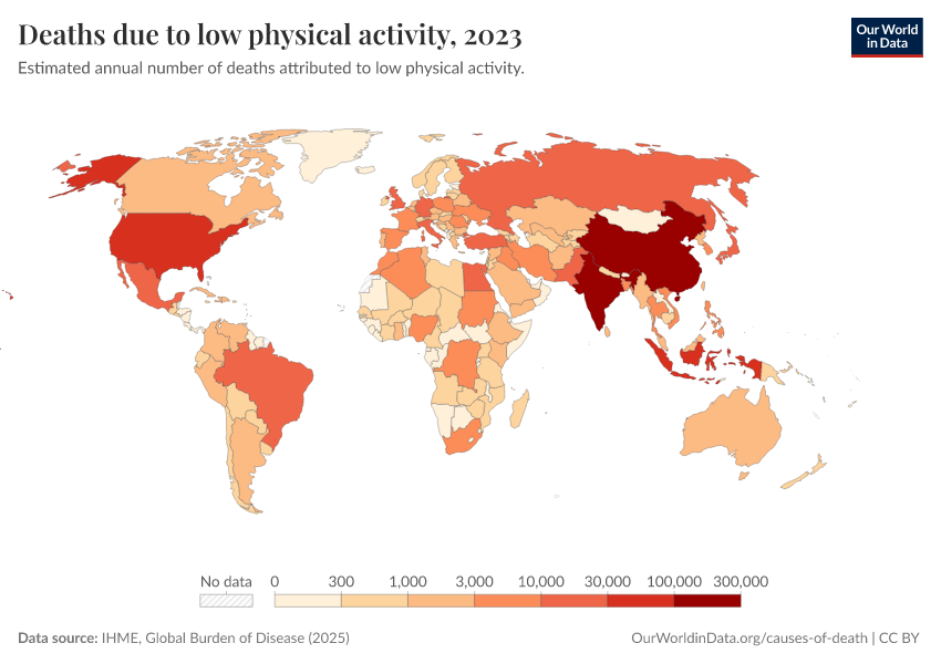 “Data Page: Deaths due to low physical activity”, part of the following publication: Esteban Ortiz-Ospina and Max Roser (2016) - “Global Health”. Data adapted from IHME, Global Burden of Disease. Retrieved from https://chart-preview-extension.owid.pages.dev:8789/20250909-093708/grapher/deaths-due-to-low-physical-activity.html [online resource] (archived on September 9, 2025).How to cite this data