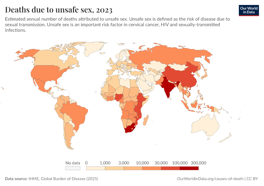 “Data Page: Deaths due to unsafe sex”, part of the following publication: Esteban Ortiz-Ospina and Max Roser (2016) - “Global Health”. Data adapted from IHME, Global Burden of Disease. Retrieved from https://chart-preview-extension.owid.pages.dev:8789/20260107-153017/grapher/deaths-due-to-unsafe-sex.html [online resource] (archived on January 7, 2026).How to cite this data