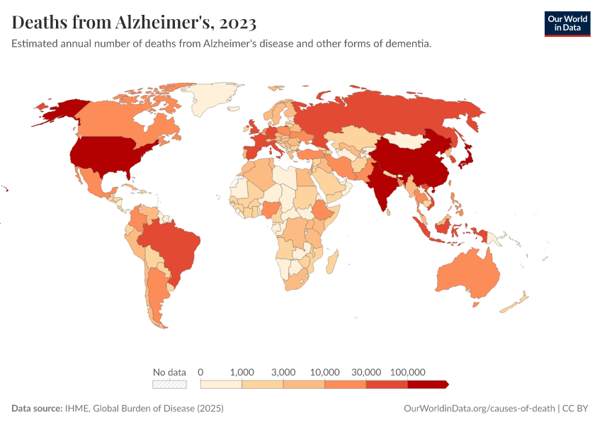 “Data Page: Deaths from Alzheimer's”, part of the following publication: Esteban Ortiz-Ospina and Max Roser (2016) - “Global Health”. Data adapted from IHME, Global Burden of Disease. Retrieved from https://chart-preview-extension.owid.pages.dev:8789/20260211-174736/grapher/deaths-from-alzheimers.html [online resource] (archived on February 11, 2026).How to cite this data