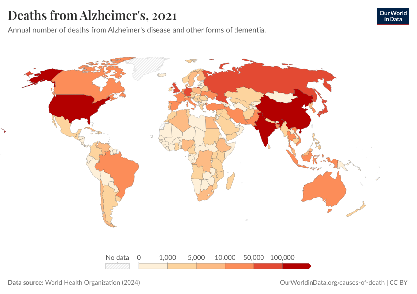 World Health Organization (2024) – with major processing by Our World in Data. “Deaths from Alzheimer's” [dataset]. World Health Organization, “Global Health Estimates” [original data]. Retrieved February 12, 2026 from https://chart-preview-extension.owid.pages.dev:8789/20250909-093708/grapher/deaths-from-alzheimers-other-dementias.html (archived on September 9, 2025).