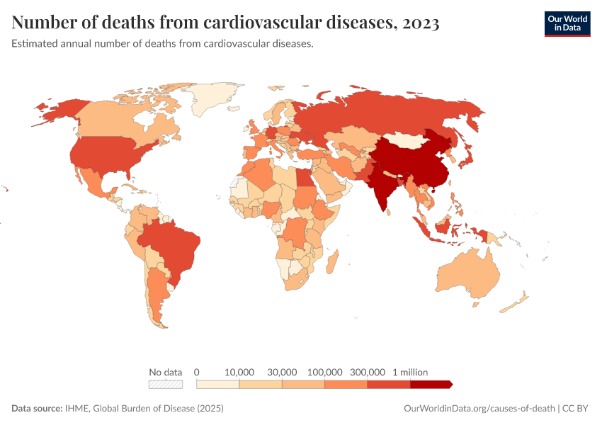“Data Page: Number of deaths from cardiovascular diseases”, part of the following publication: Esteban Ortiz-Ospina and Max Roser (2016) - “Global Health”. Data adapted from IHME, Global Burden of Disease. Retrieved from https://chart-preview-extension.owid.pages.dev:8789/20260211-174736/grapher/deaths-from-cardiovascular-disease.html [online resource] (archived on February 11, 2026).How to cite this data