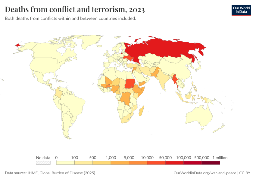 “Data Page: Deaths from conflict and terrorism”, part of the following publication: Esteban Ortiz-Ospina and Max Roser (2016) - “Global Health”. Data adapted from IHME, Global Burden of Disease. Retrieved from https://chart-preview-extension.owid.pages.dev:8789/20260211-174736/grapher/deaths-from-conflict-and-terrorism.html [online resource] (archived on February 11, 2026).How to cite this data