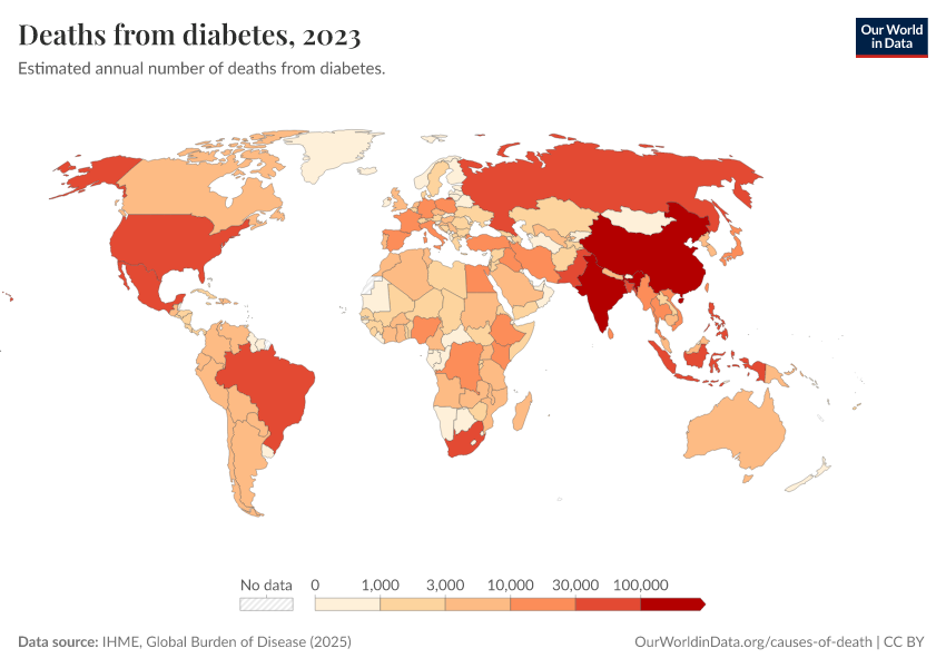 “Data Page: Deaths from diabetes”, part of the following publication: Esteban Ortiz-Ospina and Max Roser (2016) - “Global Health”. Data adapted from IHME, Global Burden of Disease. Retrieved from https://chart-preview-extension.owid.pages.dev:8789/20260211-174736/grapher/deaths-from-diabetes.html [online resource] (archived on February 11, 2026).How to cite this data