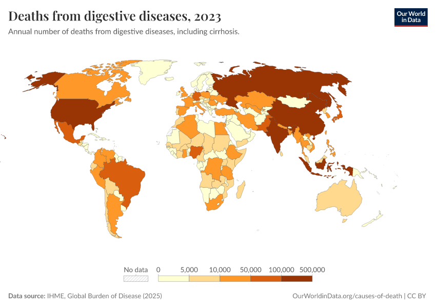 IHME, Global Burden of Disease (2025) – with major processing by Our World in Data. “Deaths from digestive diseases” [dataset]. IHME, Global Burden of Disease, “Global Burden of Disease - Deaths” [original data]. Retrieved February 12, 2026 from https://chart-preview-extension.owid.pages.dev:8789/20260211-174736/grapher/deaths-from-digestive-diseases.html (archived on February 11, 2026).
