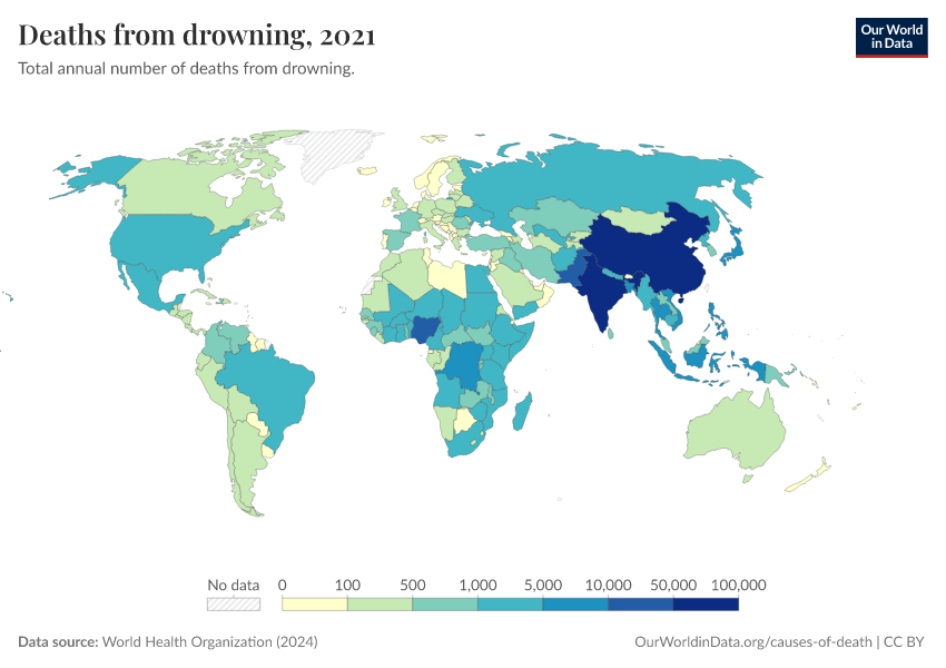 World Health Organization (2024) – with major processing by Our World in Data. “Deaths from drowning” [dataset]. World Health Organization, “Global Health Estimates” [original data]. Retrieved February 12, 2026 from https://chart-preview-extension.owid.pages.dev:8789/20250909-093708/grapher/deaths-from-drowning-ghe.html (archived on September 9, 2025).