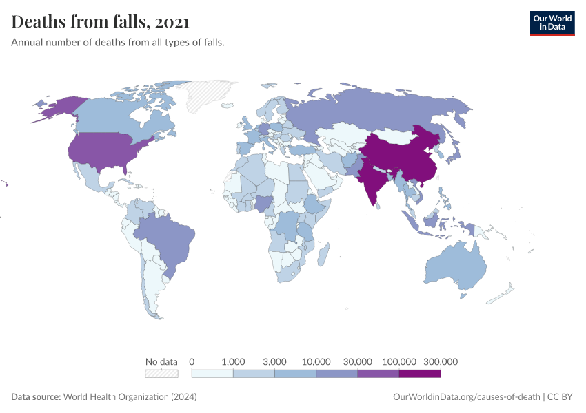 World Health Organization (2024) – with major processing by Our World in Data. “Deaths from falls” [dataset]. World Health Organization, “Global Health Estimates” [original data]. Retrieved February 12, 2026 from https://chart-preview-extension.owid.pages.dev:8789/20250909-093708/grapher/deaths-from-falls.html (archived on September 9, 2025).