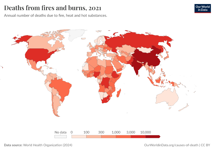 “Data Page: Deaths from fires and burns”, part of the following publication: Esteban Ortiz-Ospina and Max Roser (2016) - “Global Health”. Data adapted from World Health Organization. Retrieved from https://chart-preview-extension.owid.pages.dev:8789/20250909-093708/grapher/deaths-from-fires-and-burns-who.html [online resource] (archived on September 9, 2025).How to cite this data