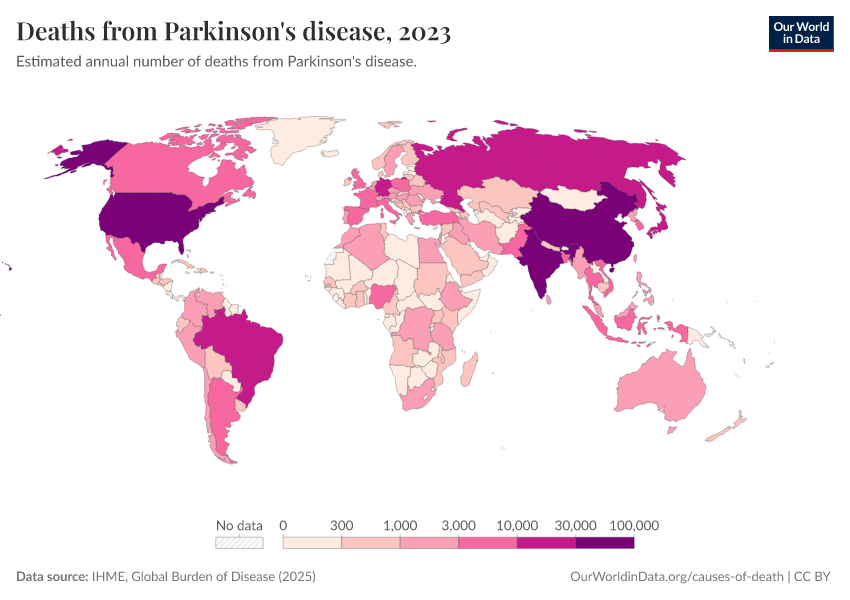 IHME, Global Burden of Disease (2025) – with major processing by Our World in Data. “Deaths from Parkinson's disease” [dataset]. IHME, Global Burden of Disease, “Global Burden of Disease - Deaths” [original data]. Retrieved February 12, 2026 from https://chart-preview-extension.owid.pages.dev:8789/20260211-174736/grapher/deaths-from-parkinsons-disease.html (archived on February 11, 2026).