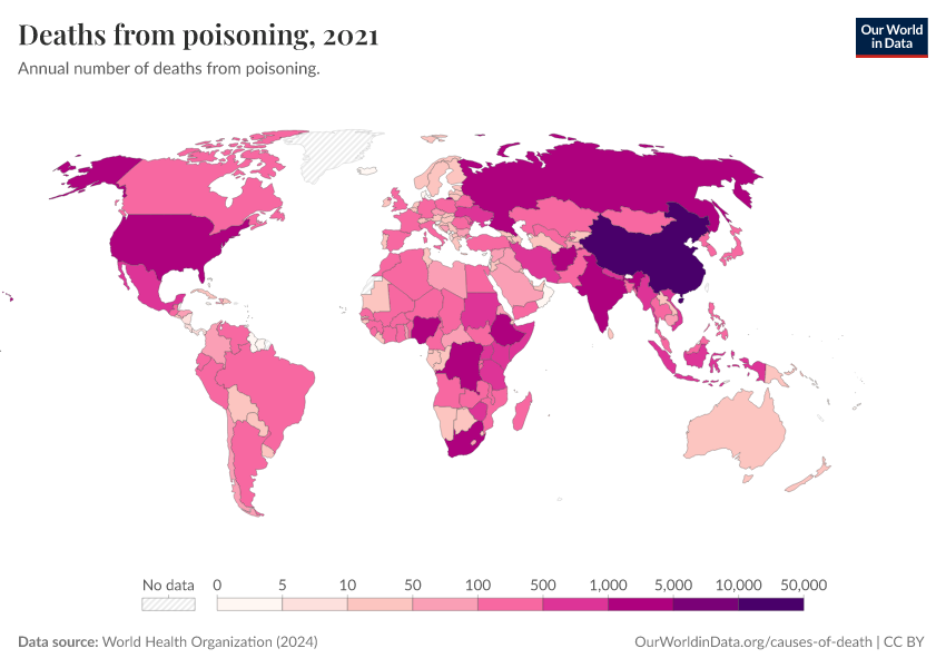 World Health Organization (2024) – with major processing by Our World in Data. “Deaths from poisoning” [dataset]. World Health Organization, “Global Health Estimates” [original data]. Retrieved February 12, 2026 from https://chart-preview-extension.owid.pages.dev:8789/20250909-093708/grapher/deaths-from-poisonings-ghe.html (archived on September 9, 2025).