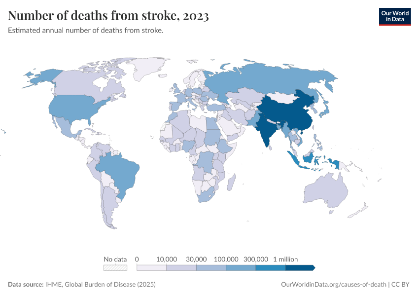 IHME, Global Burden of Disease (2025) – with major processing by Our World in Data. “Number of deaths from stroke” [dataset]. IHME, Global Burden of Disease, “Global Burden of Disease - Deaths” [original data]. Retrieved February 12, 2026 from https://chart-preview-extension.owid.pages.dev:8789/20260211-174736/grapher/deaths-from-strokes.html (archived on February 11, 2026).