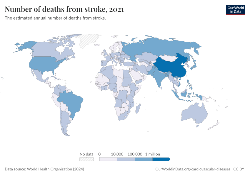 World Health Organization (2024) – with major processing by Our World in Data. “Number of deaths from stroke” [dataset]. World Health Organization, “Global Health Estimates” [original data]. Retrieved February 12, 2026 from https://chart-preview-extension.owid.pages.dev:8789/20250909-093708/grapher/deaths-from-strokes-ghe.html (archived on September 9, 2025).