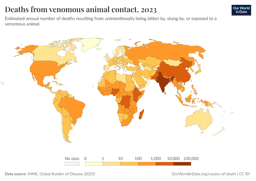 IHME, Global Burden of Disease (2025) – with major processing by Our World in Data. “Deaths from venomous animal contact” [dataset]. IHME, Global Burden of Disease, “Global Burden of Disease - Deaths” [original data]. Retrieved February 12, 2026 from https://chart-preview-extension.owid.pages.dev:8789/20260211-174736/grapher/deaths-from-venomous-animal-contact.html (archived on February 11, 2026).