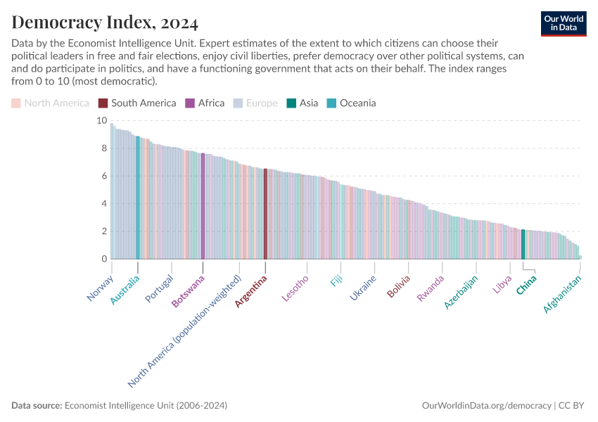 Economist Intelligence Unit (2006-2024) – processed by Our World in Data. “Democracy index – Economist Intelligence Unit” [dataset]. Economist Intelligence Unit, “Democracy Index 2021: The China challenge”; Economist Intelligence Unit, “Democracy Index 2022: Frontline democracy and the battle for Ukraine”; Economist Intelligence Unit, “Democracy Index 2023: Age of Conflict”; Economist Intelligence Unit, “Democracy Index 2024: What's wrong with representative democracy?”; Gapminder, “Democracy Index v4”; Various sources, “Population” [original data]. Retrieved February 12, 2026 from https://chart-preview-extension.owid.pages.dev:8789/20260119-070102/grapher/democracy-index-eiu.html (archived on January 19, 2026).