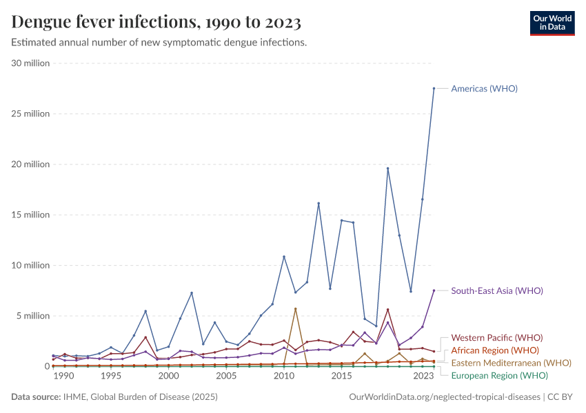 “Data Page: Dengue fever infections”, part of the following publication: Esteban Ortiz-Ospina and Max Roser (2016) - “Global Health”. Data adapted from IHME, Global Burden of Disease. Retrieved from https://chart-preview-extension.owid.pages.dev:8789/20251001-144546/grapher/dengue-incidence.html [online resource] (archived on October 1, 2025).How to cite this data