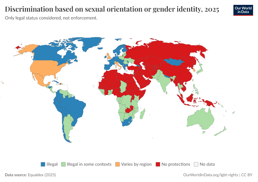 Equaldex (2025) – with major processing by Our World in Data. “Discrimination based on sexual orientation or gender identity” [dataset]. Equaldex, “Equaldex” [original data]. Retrieved February 12, 2026 from https://chart-preview-extension.owid.pages.dev:8789/20250909-093708/grapher/discrimination-lgbt-equaldex.html (archived on September 9, 2025).