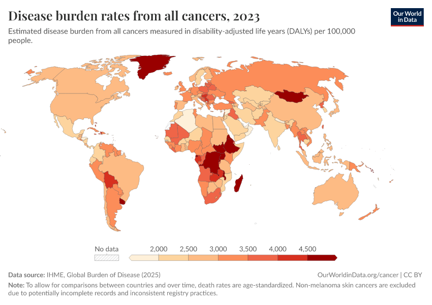 IHME, Global Burden of Disease (2025) – with major processing by Our World in Data. “Disease burden rates from all cancers” [dataset]. IHME, Global Burden of Disease, “Global Burden of Disease - DALYs” [original data]. Retrieved February 12, 2026 from https://chart-preview-extension.owid.pages.dev:8789/20260211-174736/grapher/disease-burden-rates-from-cancers.html (archived on February 11, 2026).