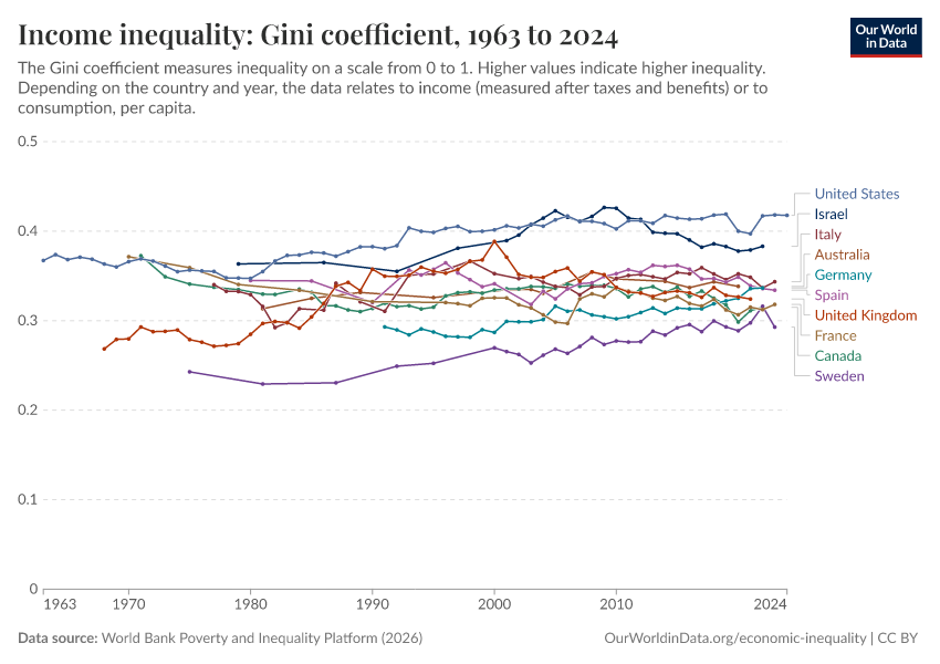 “Data Page: Income inequality: Gini coefficient”, part of the following publication: Joe Hasell, Bertha Rohenkohl, Pablo Arriagada, Esteban Ortiz-Ospina, and Max Roser (2023) - “Economic Inequality”. Data adapted from World Bank Poverty and Inequality Platform. Retrieved from https://chart-preview-extension.owid.pages.dev:8789/20260127-114142/grapher/economic-inequality-gini-index.html [online resource] (archived on January 27, 2026).How to cite this data