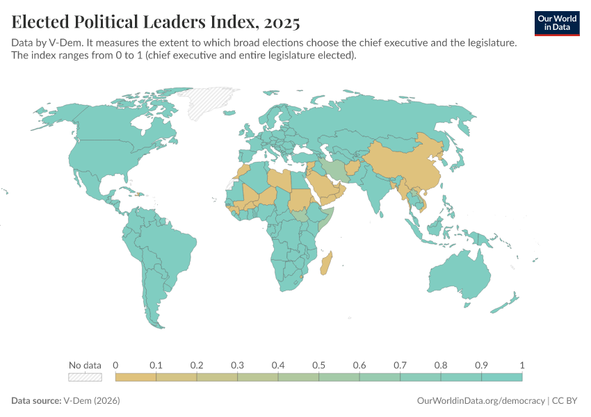 “Data Page: Elected officials index”, part of the following publication: Bastian Herre, Lucas Rodés-Guirao, and Esteban Ortiz-Ospina (2013) - “Democracy”. Data adapted from V-Dem. Retrieved from https://chart-preview-extension.owid.pages.dev:8789/20260119-070102/grapher/elected-political-leaders-index.html [online resource] (archived on January 19, 2026).How to cite this data