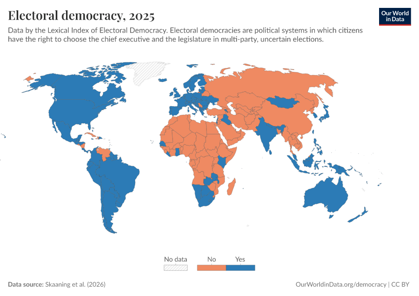 “Data Page: Electoral democracy”, part of the following publication: Bastian Herre, Lucas Rodés-Guirao, and Esteban Ortiz-Ospina (2013) - “Democracy”. Data adapted from Skaaning et al.. Retrieved from https://chart-preview-extension.owid.pages.dev:8789/20260119-065148/grapher/electoral-democracy-lexical.html [online resource] (archived on January 19, 2026).How to cite this data