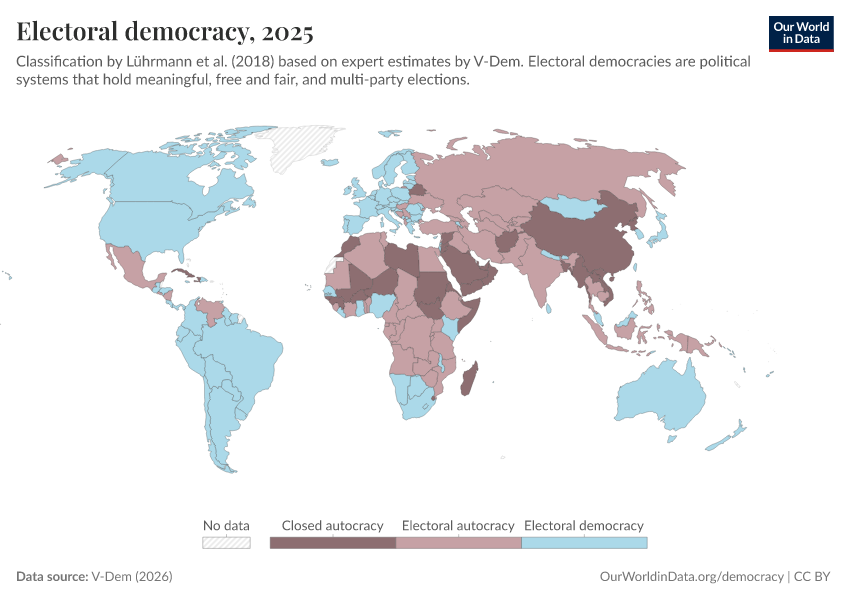V-Dem (2025) – processed by Our World in Data. “Political regime – reduced” [dataset]. V-Dem, “Democracy report v15” [original data]. Retrieved February 12, 2026 from https://chart-preview-extension.owid.pages.dev:8789/20260119-070102/grapher/electoral-democracy-row.html (archived on January 19, 2026).