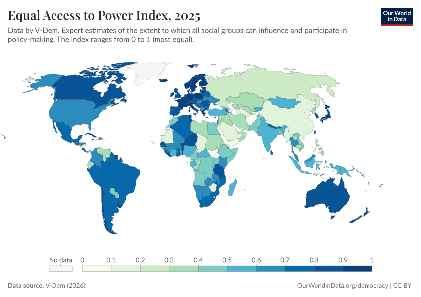 “Data Page: Equal access to power index”, part of the following publication: Bastian Herre, Lucas Rodés-Guirao, and Esteban Ortiz-Ospina (2013) - “Democracy”. Data adapted from V-Dem. Retrieved from https://chart-preview-extension.owid.pages.dev:8789/20260119-070102/grapher/equal-access-to-power-index.html [online resource] (archived on January 19, 2026).How to cite this data