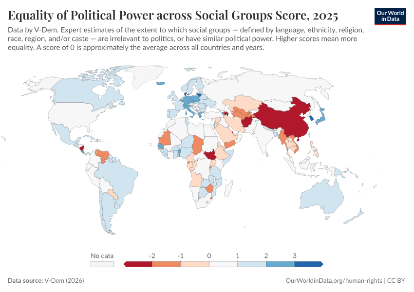 “Data Page: Equality of political power across social groups”, part of the following publication: Bastian Herre, Lucas Rodés-Guirao, and Esteban Ortiz-Ospina (2013) - “Democracy”. Data adapted from V-Dem. Retrieved from https://chart-preview-extension.owid.pages.dev:8789/20260204-170225/grapher/equality-of-political-power-across-social-groups-score.html [online resource] (archived on February 4, 2026).How to cite this data