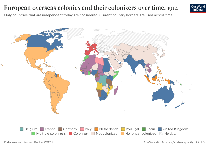 “Data Page: European overseas colonies and their colonizers over time”, part of the following publication: Bastian Herre and Pablo Arriagada (2023) - “State Capacity”. Data adapted from Bastian Becker. Retrieved from https://chart-preview-extension.owid.pages.dev:8789/20250909-093708/grapher/european-overseas-colonies-and-their-colonizers.html [online resource] (archived on September 9, 2025).How to cite this data