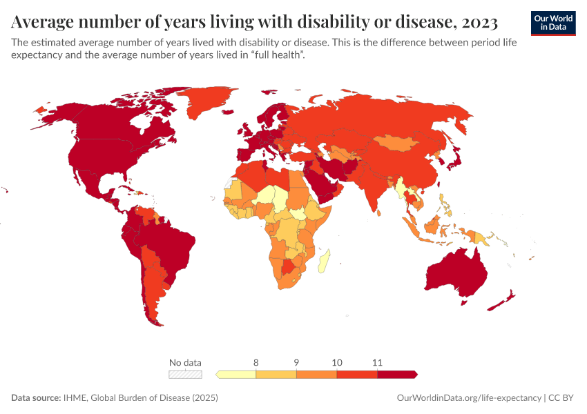“Data Page: Average number of years living with disability or disease”, part of the following publication: Saloni Dattani, Lucas Rodés-Guirao, Hannah Ritchie, Esteban Ortiz-Ospina, and Max Roser (2023) - “Life Expectancy”. Data adapted from IHME, Global Burden of Disease. Retrieved from https://chart-preview-extension.owid.pages.dev:8789/20250909-093708/grapher/expected-years-of-living-with-disability-or-disease-burden.html [online resource] (archived on September 9, 2025).How to cite this data