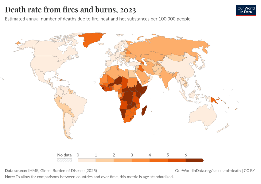 IHME, Global Burden of Disease (2025) – with major processing by Our World in Data. “Death rate from fires and burns” [dataset]. IHME, Global Burden of Disease, “Global Burden of Disease - Deaths” [original data]. Retrieved February 12, 2026 from https://chart-preview-extension.owid.pages.dev:8789/20260211-173942/grapher/fire-death-rates.html (archived on February 11, 2026).