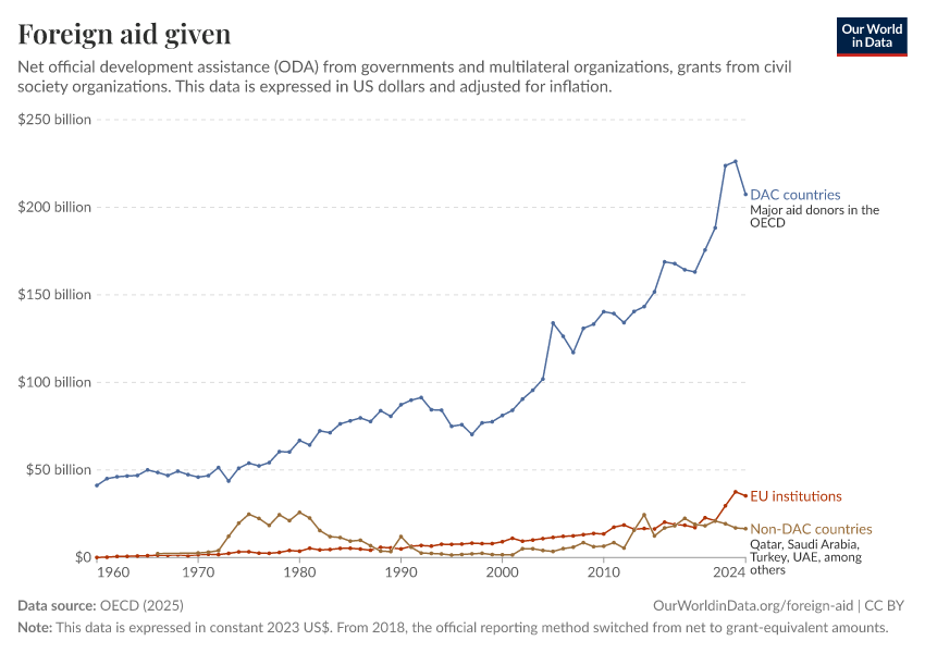 OECD (2025) – with major processing by Our World in Data. “Foreign aid given – Net disbursements” [dataset]. OECD, “OECD Official Development Assistance (ODA) - DAC1: Flows by provider (ODA+OOF+Private)”; OECD, “OECD Official Development Assistance (ODA) - DAC2A: Aid (ODA) disbursements to countries and regions” [original data]. Retrieved February 12, 2026 from https://chart-preview-extension.owid.pages.dev:8789/20251230-141326/grapher/foreign-aid-given-net.html (archived on December 30, 2025).