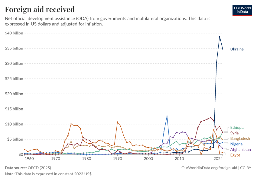 OECD (2025) – with major processing by Our World in Data. “Foreign aid received – Official donors” [dataset]. OECD, “OECD Official Development Assistance (ODA) - DAC2A: Aid (ODA) disbursements to countries and regions” [original data]. Retrieved February 12, 2026 from https://chart-preview-extension.owid.pages.dev:8789/20260119-065148/grapher/foreign-aid-received-net.html (archived on January 19, 2026).