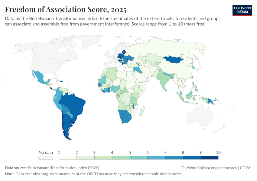 “Data Page: Freedom of Association Score”, part of the following publication: Bastian Herre, Lucas Rodés-Guirao, and Esteban Ortiz-Ospina (2013) - “Democracy”. Data adapted from Bertelsmann Transformation Index. Retrieved from https://chart-preview-extension.owid.pages.dev:8789/20260204-165456/grapher/freedom-of-association-score-bti.html [online resource] (archived on February 4, 2026).How to cite this data