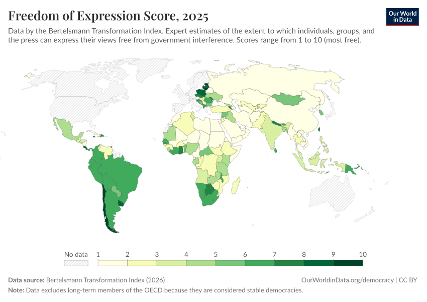 “Data Page: Freedom of Expression Score”, part of the following publication: Bastian Herre, Lucas Rodés-Guirao, and Esteban Ortiz-Ospina (2013) - “Democracy”. Data adapted from Bertelsmann Transformation Index. Retrieved from https://chart-preview-extension.owid.pages.dev:8789/20260204-165456/grapher/freedom-of-expression-score-bti.html [online resource] (archived on February 4, 2026).How to cite this data