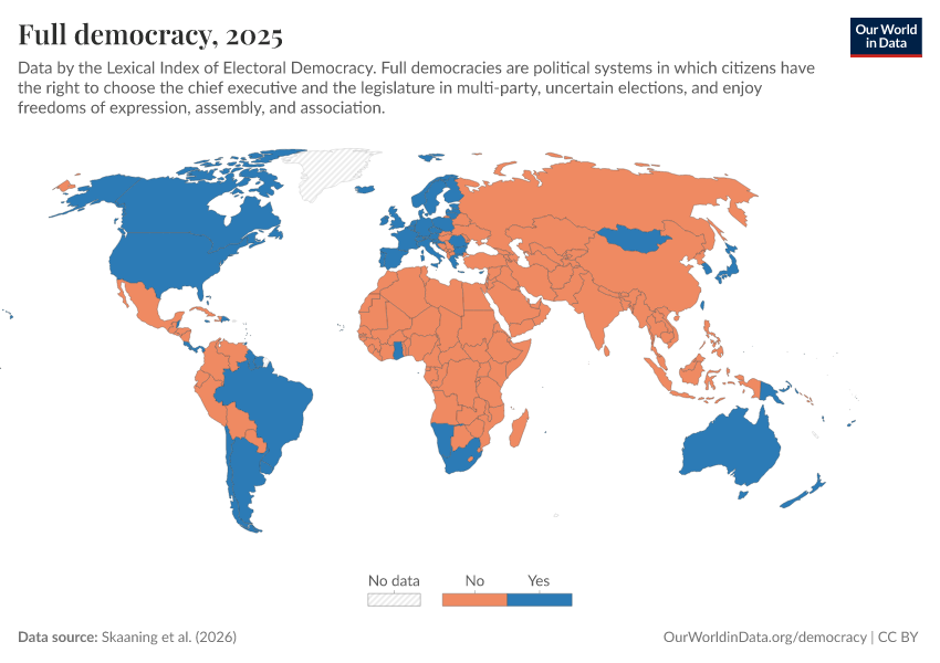 “Data Page: Full democracy”, part of the following publication: Bastian Herre, Lucas Rodés-Guirao, and Esteban Ortiz-Ospina (2013) - “Democracy”. Data adapted from Skaaning et al.. Retrieved from https://chart-preview-extension.owid.pages.dev:8789/20260119-065148/grapher/full-democracy-lexical.html [online resource] (archived on January 19, 2026).How to cite this data