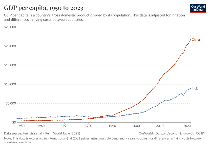 “Data Page: GDP per capita”, part of the following publication: Max Roser, Bertha Rohenkohl, Pablo Arriagada, Joe Hasell, Hannah Ritchie, and Esteban Ortiz-Ospina (2023) - “Economic Growth”. Data adapted from Feenstra et al.. Retrieved from https://chart-preview-extension.owid.pages.dev:8789/20251013-111729/grapher/gdp-per-capita-penn-world-table.html [online resource] (archived on October 13, 2025).