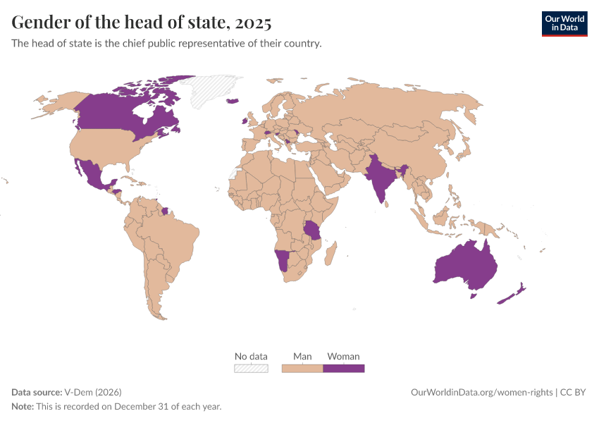 V-Dem (2025) – processed by Our World in Data. “Gender of the head of state” [dataset]. V-Dem, “Democracy report v15” [original data]. Retrieved February 12, 2026 from https://chart-preview-extension.owid.pages.dev:8789/20260119-070102/grapher/gender-of-the-head-of-state.html (archived on January 19, 2026).