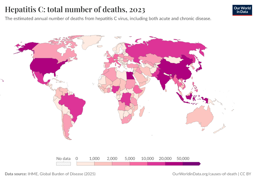 “Data Page: Hepatitis C: total number of deaths”, part of the following publication: Esteban Ortiz-Ospina and Max Roser (2016) - “Global Health”. Data adapted from IHME, Global Burden of Disease. Retrieved from https://chart-preview-extension.owid.pages.dev:8789/20260211-174736/grapher/hepatitis-c-number-of-deaths.html [online resource] (archived on February 11, 2026).How to cite this data