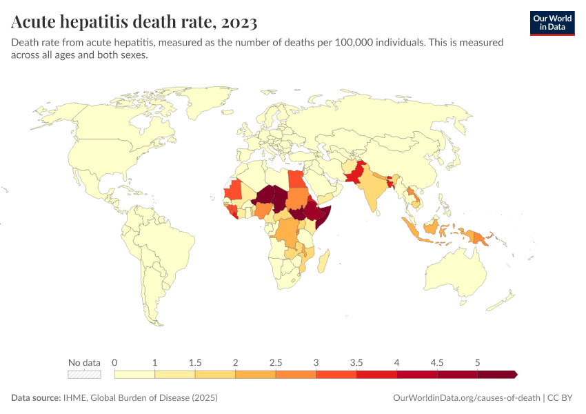 “Data Page: Acute hepatitis death rate”, part of the following publication: Esteban Ortiz-Ospina and Max Roser (2016) - “Global Health”. Data adapted from IHME, Global Burden of Disease. Retrieved from https://chart-preview-extension.owid.pages.dev:8789/20260211-174736/grapher/hepatitis-death-rate.html [online resource] (archived on February 11, 2026).How to cite this data