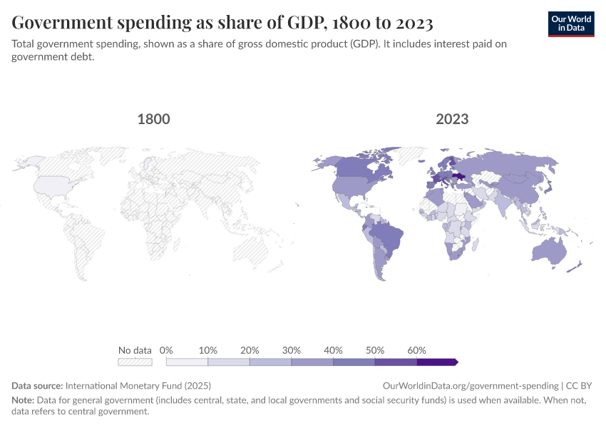 International Monetary Fund (2025) – with minor processing by Our World in Data. “Government spending as share of GDP” [dataset]. International Monetary Fund, “Public Finances in Modern History” [original data]. Retrieved February 12, 2026 from https://chart-preview-extension.owid.pages.dev:8789/20250909-093708/grapher/historical-gov-spending-gdp.html (archived on September 9, 2025).