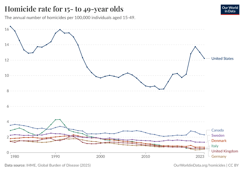 IHME, Global Burden of Disease (2025) – with major processing by Our World in Data. “Homicide rate for 15- to 49-year olds” [dataset]. IHME, Global Burden of Disease, “Global Burden of Disease - Deaths” [original data]. Retrieved February 12, 2026 from https://chart-preview-extension.owid.pages.dev:8789/20260211-174736/grapher/homicide-rate-in-15--to-49-year-olds.html (archived on February 11, 2026).