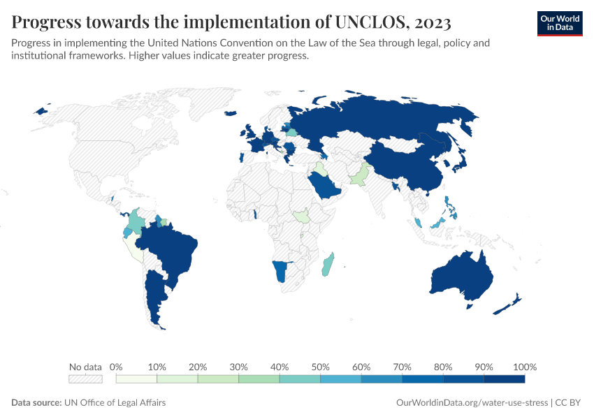 “Data Page: Progress towards the implementation of UNCLOS”. Our World in Data (2026). Data adapted from UN Office of Legal Affairs. Retrieved from https://chart-preview-extension.owid.pages.dev:8789/20251120-211749/grapher/implementation-of-unclos.html [online resource] (archived on November 20, 2025).How to cite this data