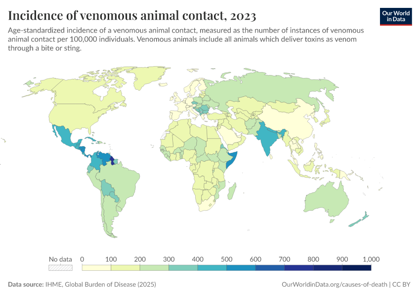 IHME, Global Burden of Disease (2024) – with major processing by Our World in Data. “Incidence of venomous animal contact” [dataset]. IHME, Global Burden of Disease, “Global Burden of Disease - Prevalence” [original data]. Retrieved February 12, 2026 from https://chart-preview-extension.owid.pages.dev:8789/20250909-093708/grapher/incidence-of-venomous-animal-contact.html (archived on September 9, 2025).